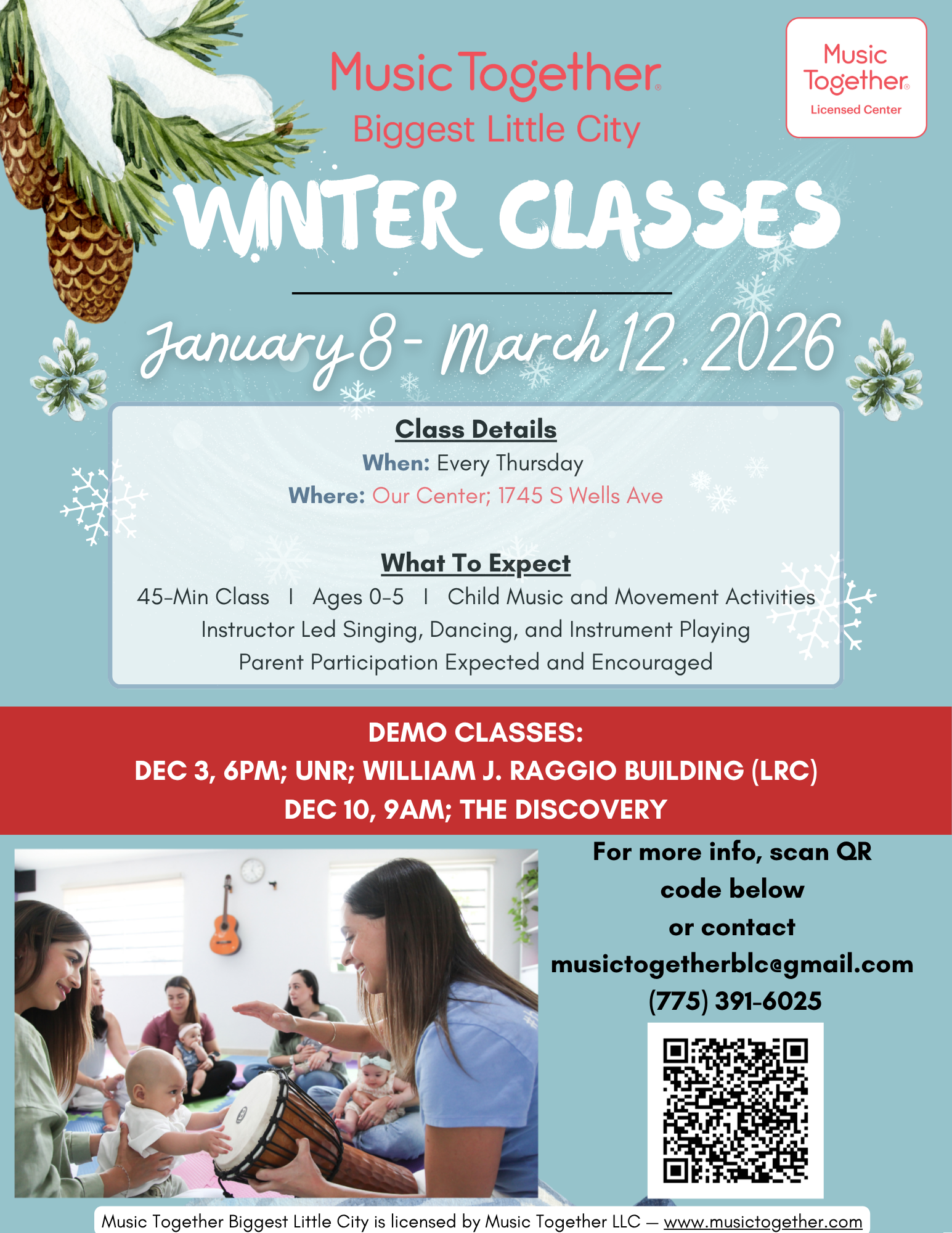 Every week in our music classes at Reno, babies, toddlers, preschoolers, and the grownups who love them® come together to play together musically. Little ones love playing along in class, and caregivers love being a part of their children’s growth into confident music-makers. And everyone loves our songs that’ll have you tapping along in no time. Music Together® is the perfect family activity in Reno!