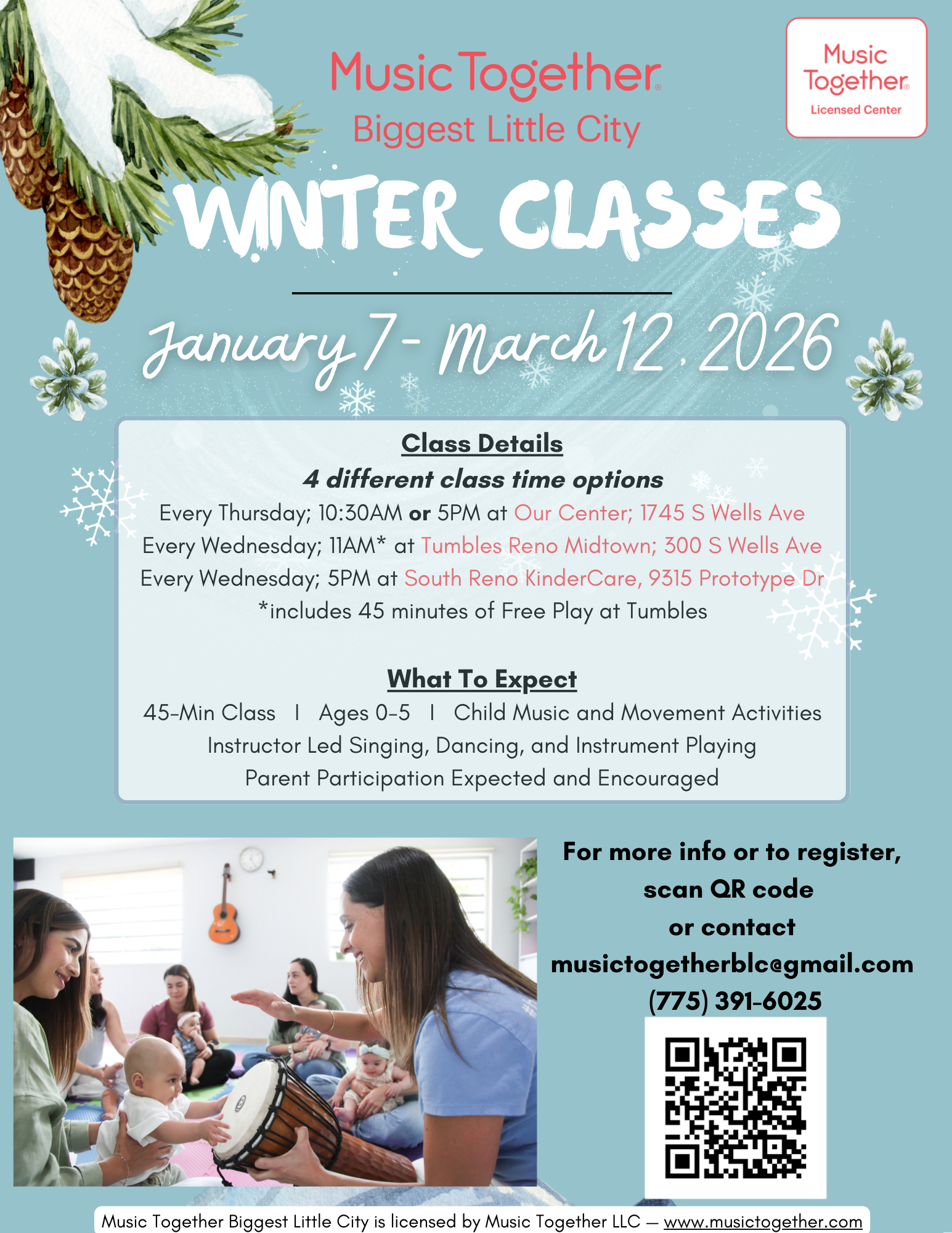 Every week in our music classes at Reno, babies, toddlers, preschoolers, and the grownups who love them® come together to play together musically. Little ones love playing along in class, and caregivers love being a part of their children’s growth into confident music-makers. And everyone loves our songs that’ll have you tapping along in no time. Music Together® is the perfect family activity in Reno!